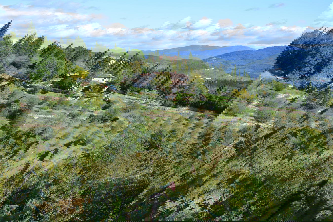 Situated on a fully functional family farm, the private gazebo, garden and terrace have panoramic views of Tuscan olive groves