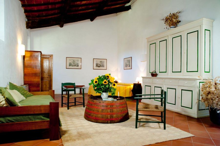Camerata is situated in a portion of a typical Tuscan farmhouse, with the soft beige colored stones.  This spacious country style rental has a living room area on the ground floor opens to a sweet little area where one can enjoy a picnic meal or some Tuscan solitude. This rental will comfortably sleeps 5 persons.
