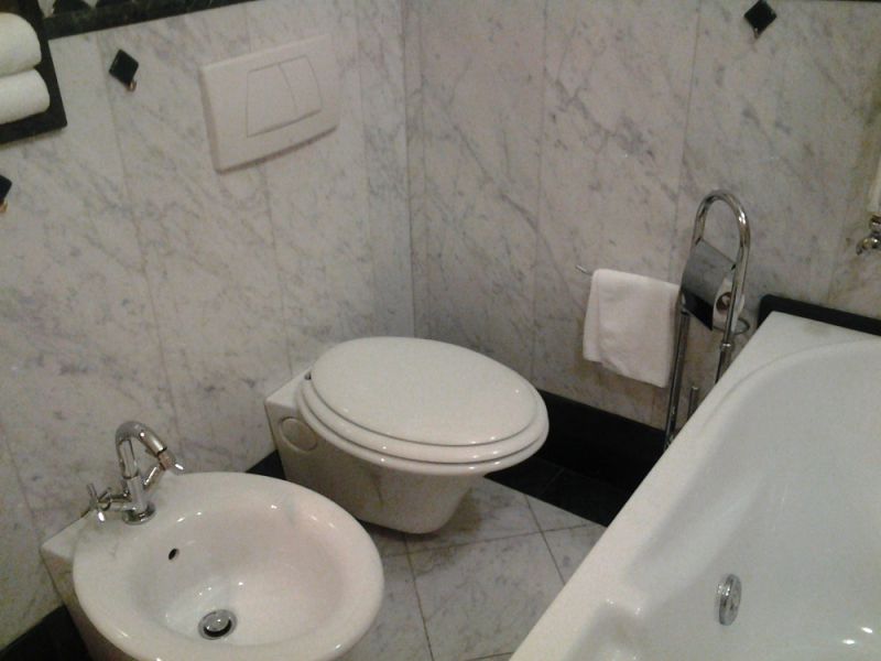 The bathroom, stylized in white and green marble from Carrara, features both a jacuzzi tub and a shower. The apartment is furnished with all necessary bed, bath and kitchen linens. A minimum 3 days stay is required and it includes final cleaning, gas, water and electric consumption and linen.