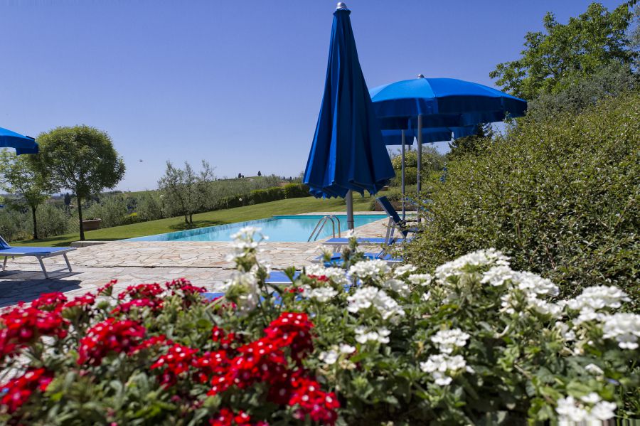 One of the most popular areas at the Podere Casanova is the swimming pool, the ideal place to hang out during the warm summer months as well as in the evenings while savoring a glass of wine and enjoying the view.
