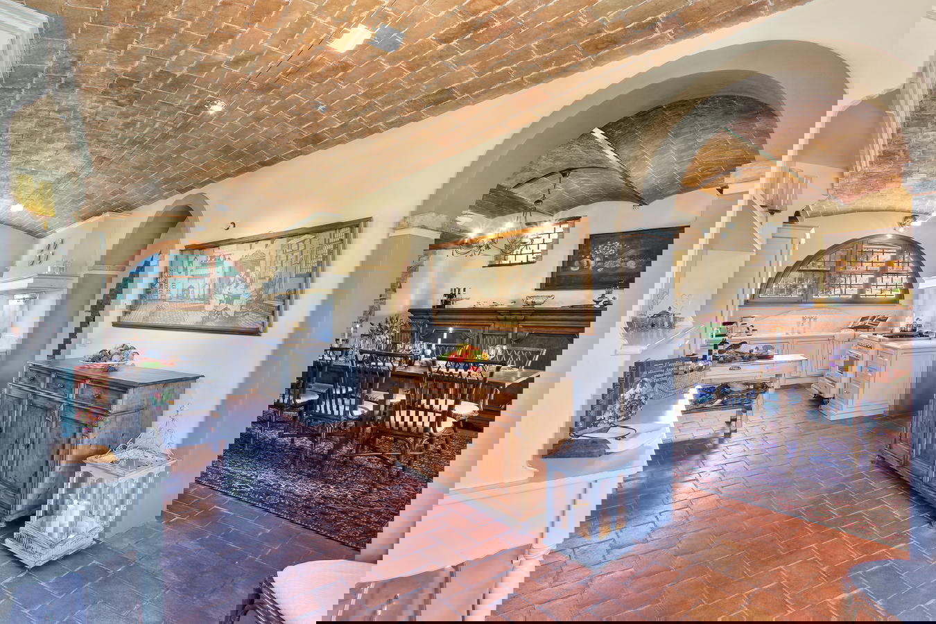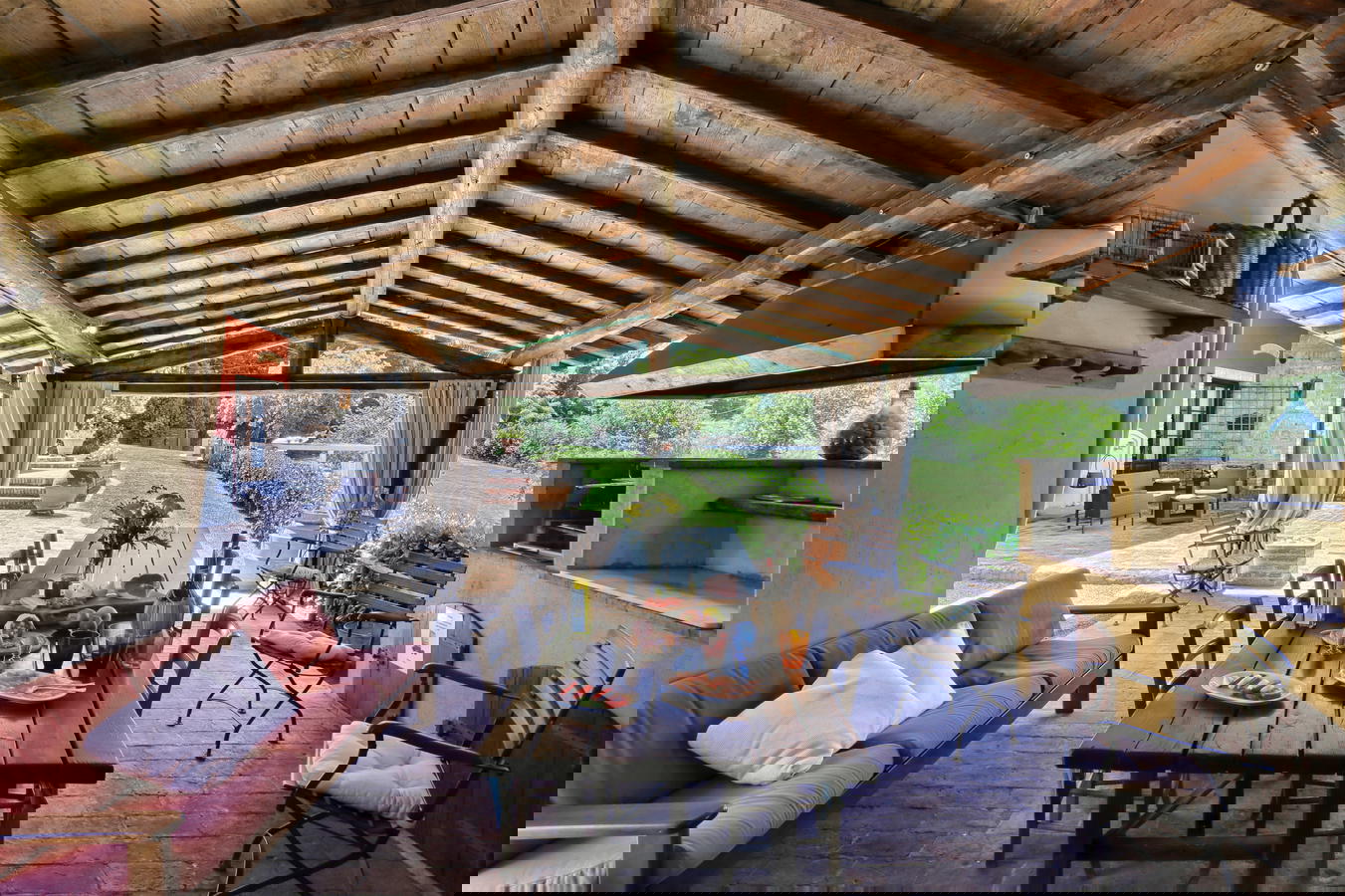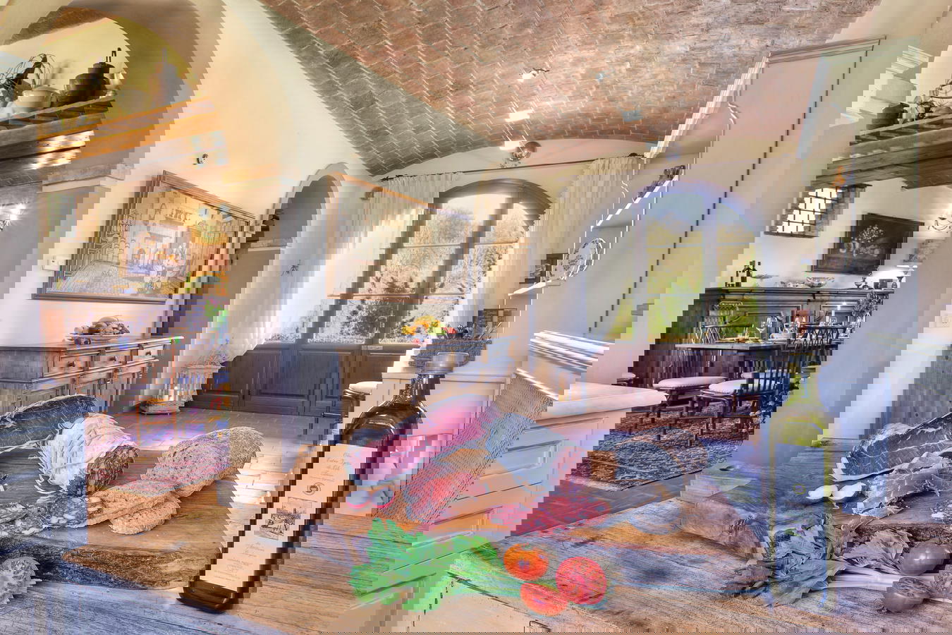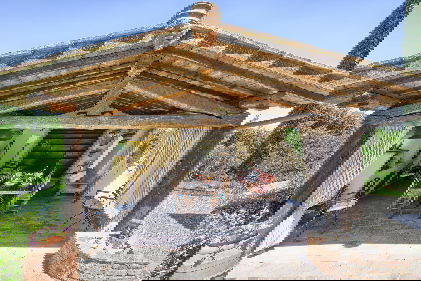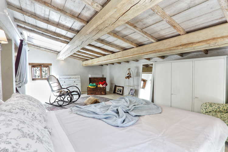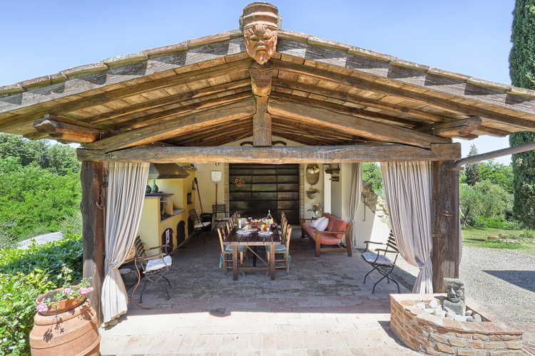 Next to the main villa is a covered area with a wood-fired pizza oven, a BBQ area and a refrigerator. The outdoor table is large enough to accommodate the entire party on vacation thus making Villa La Fonte the perfect holiday rental to accommodation groups in all seasons where the spacious interiors with the lovely wood beam ceilings and terracotta floors can be enjoyed in cooler temps, while the large garden and wonderful views in the warmer months.