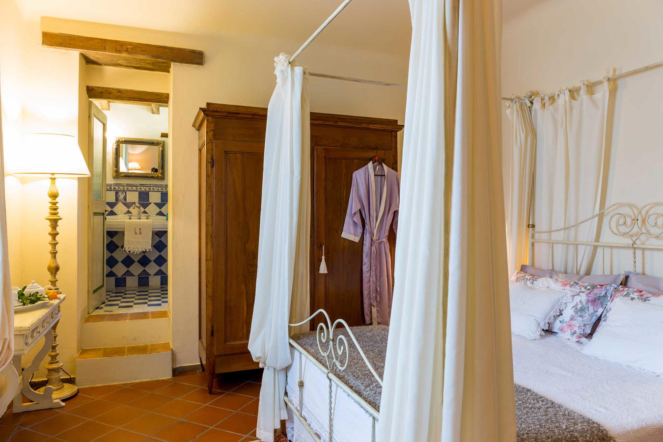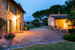 Next door to the main vacation villa rental at Villa La Fonte is the dépendance or outbuilding; this two floor building provides a private corner for couples or families traveling with the larger group. It is not connected with an adjoining passageway, but it is close enough to make it easy to visit often and is perfect for anyone in the group traveling with limited mobility, accommodating a wheelchair. It features its own dedicated covered patio area, which is well lit at night, and overlooks the garden and pool.