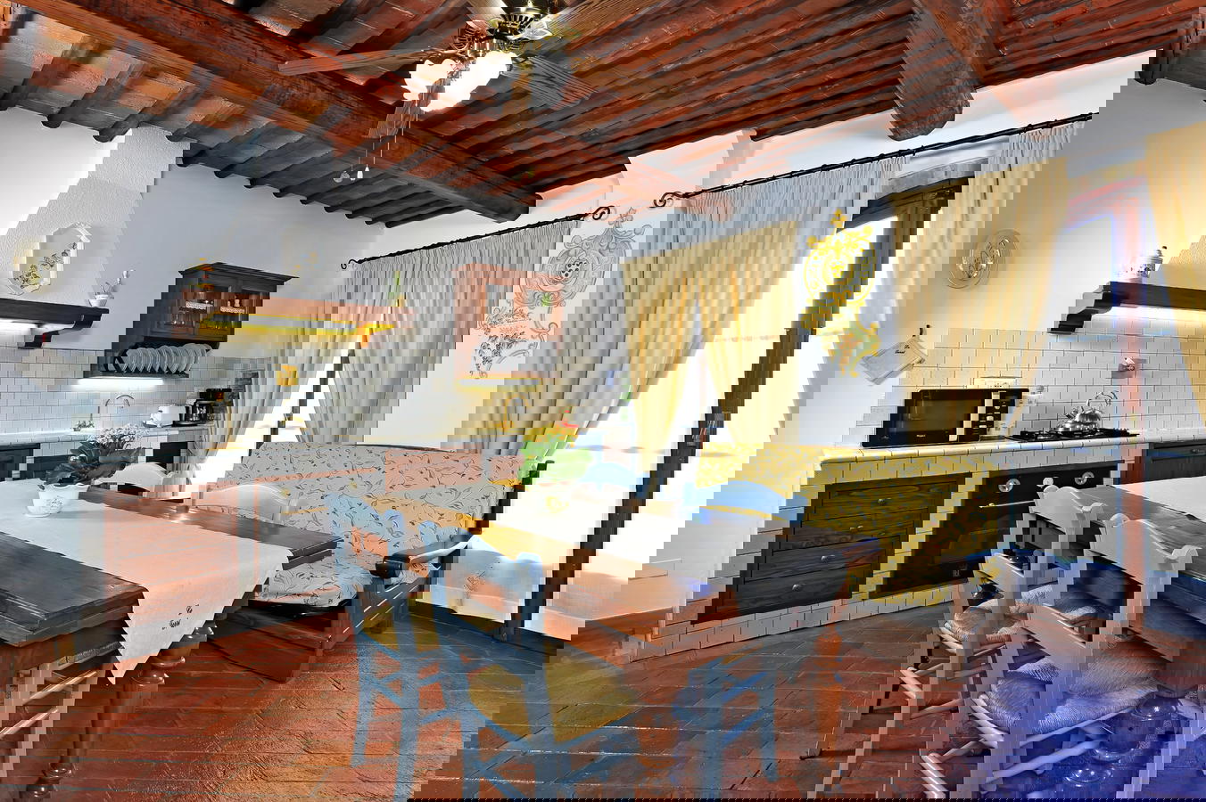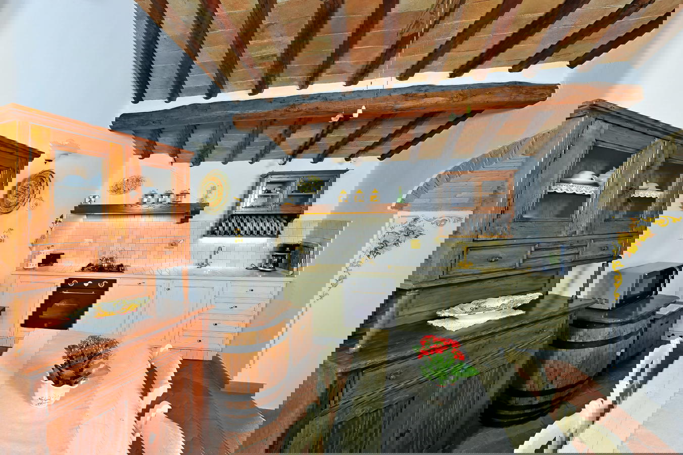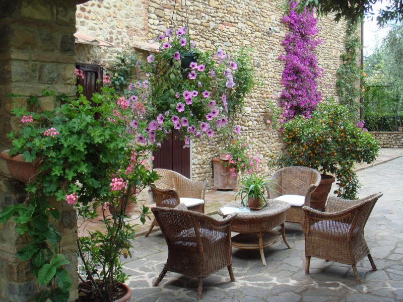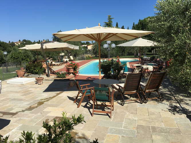 Each of the comfortable apartments has full access to the many secluded and sunny garden areas, tables and chairs, BBQ area and pool. As of this year, they have added a new panoramic area to the property where you can enjoy the Tuscan sunsets, the scenic vista over the nearby olive groves and if you are curious you can follow Paolo into the vegetable garden to pick tomatoes, zucchini and lettuce. The apartments reflect a distinct traditional decor with terracotta floors, exposed beams and rustic furnishings while assuring the guest of many modern amenities. The extra comforts include a fully-equipped kitchen, dishwasher, and wireless Internet access throughout the entire property, as well as a shared washer and dryer.