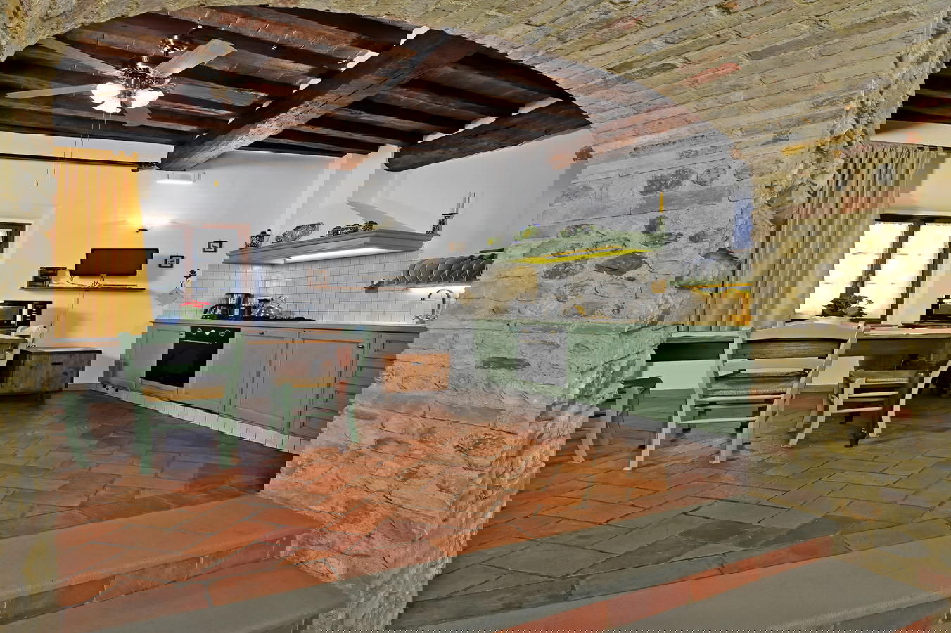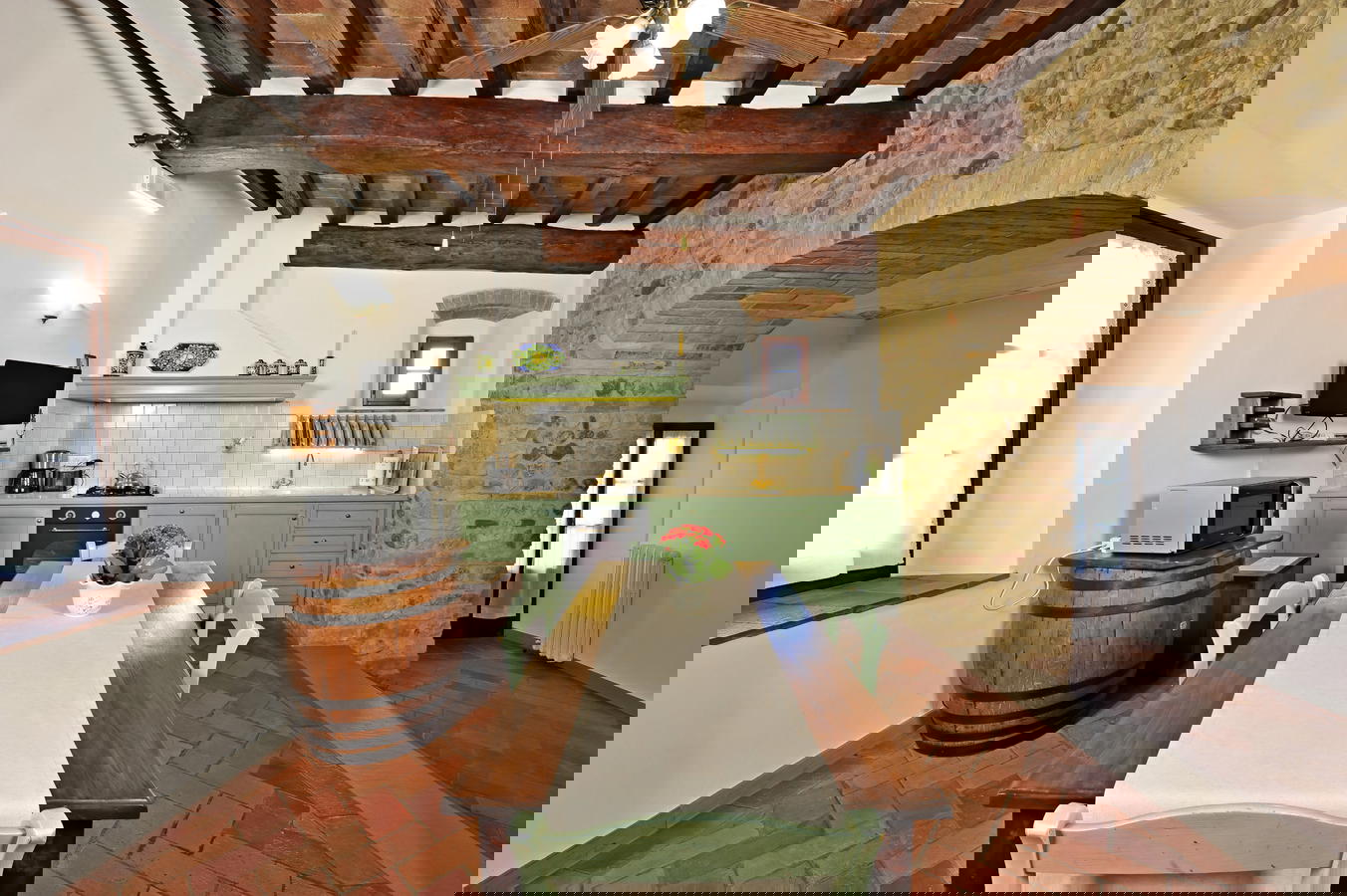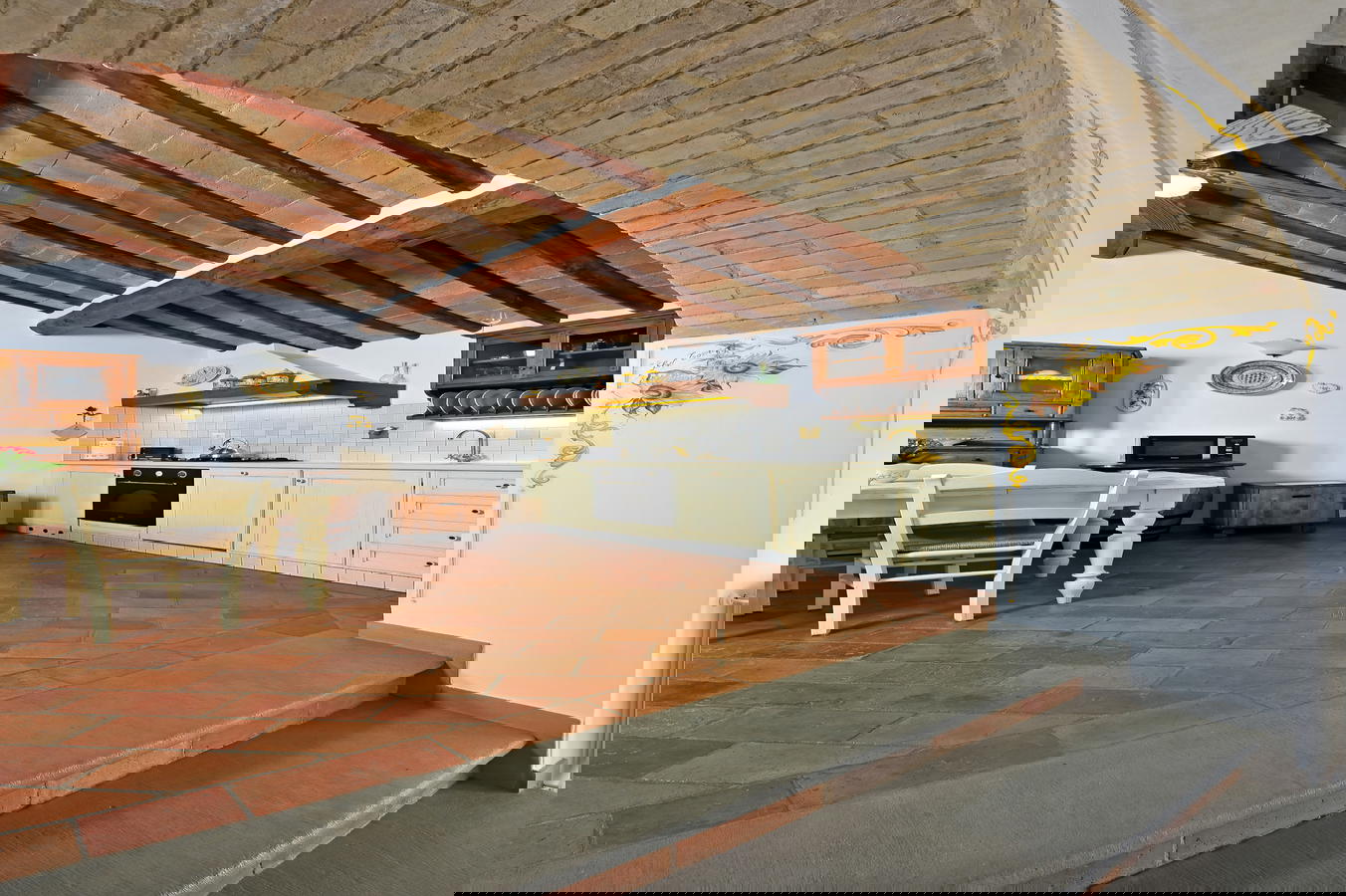 Each of the comfortable apartments has full access to the many secluded and sunny garden areas, tables and chairs, BBQ area and pool. As of this year, they have added a new panoramic area to the property where you can enjoy the Tuscan sunsets, the scenic vista over the nearby olive groves and if you are curious you can follow Paolo into the vegetable garden to pick tomatoes, zucchini and lettuce. The apartments reflect a distinct traditional decor with terracotta floors, exposed beams and rustic furnishings while assuring the guest of many modern amenities. The extra comforts include a fully-equipped kitchen, dishwasher, and wireless Internet access throughout the entire property, as well as a shared washer and dryer.