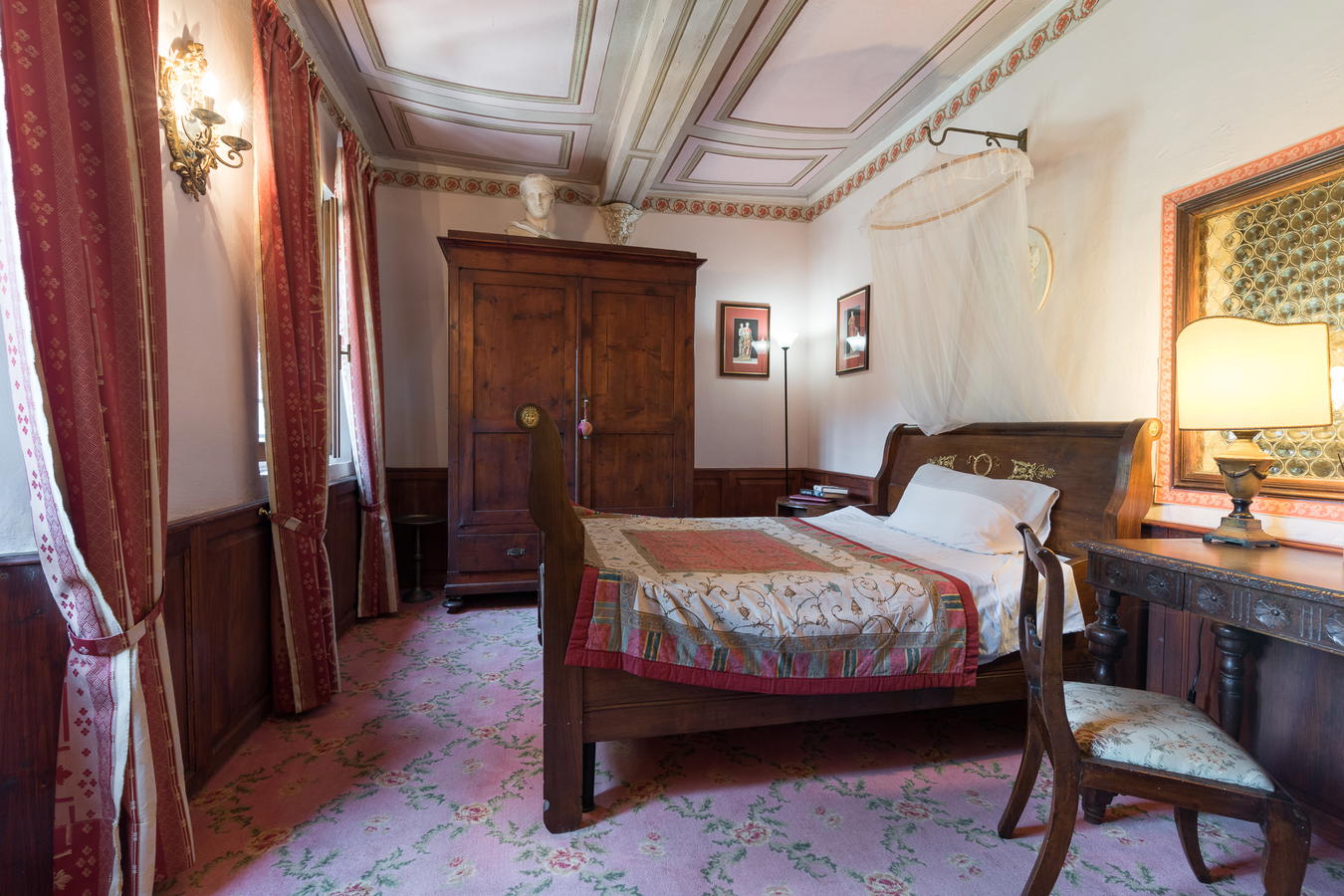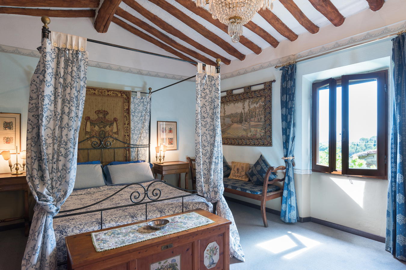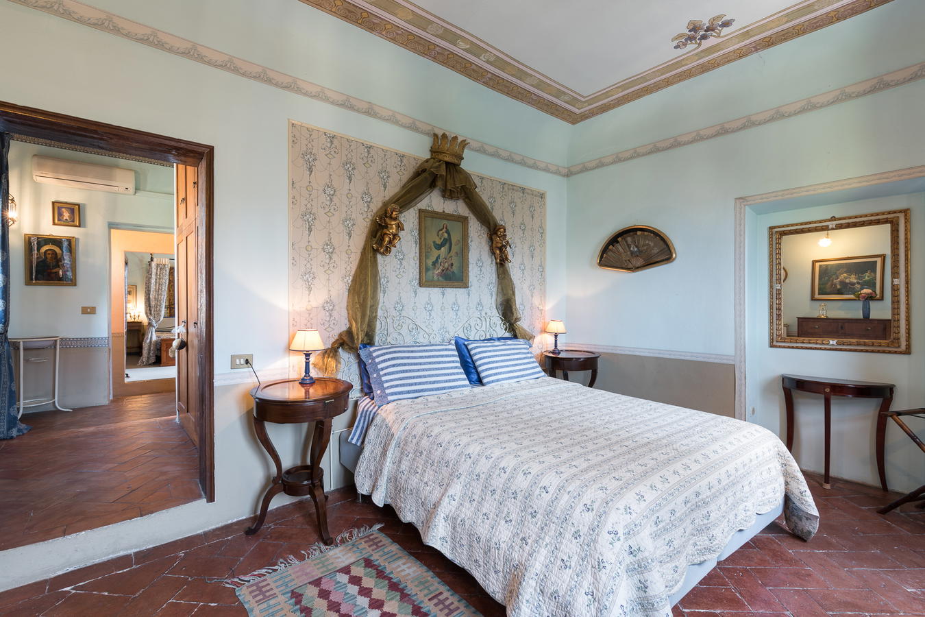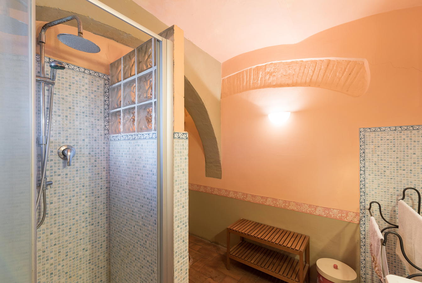 Up stairs you will find two double bedrooms, a whimsical decor and an inviting setting. The larger of the two bedrooms commands a view of the Tuscan hills and Florence in the distance. Both bedrooms are provided with air conditioning for your comfort. There is a king size wrought iron, 4 poster bed, tapestries and a view of the wood beam ceiling. The frescoed ceiling in the second bedroom adds to its romantic floral motif. It comes with a double bed which can be converted into two time beds upon request. These two rooms share a large bathroom with a tub.