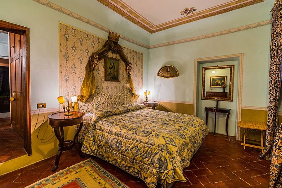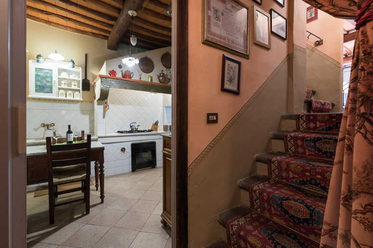 The entrance to Villa Lysis opens to a cosy living room with fireplace, comfortable sofas and direct access to the private garden area. You will find a SAT TV and radio for your entertainment. There is a bedroom on the ground floor with a lovely large single sleigh bed, romantic and inviting. The medieval cellar boasts stone walls, a curved vaulted ceiling and has been transformed into an area to enjoy the local wines in a suggestive setting.  The dining room has a table for six with a fireplace and garden view. The eat-in kitchen makes excellent use of the architectural structure and is furnished with a stove and oven, microwave, American coffee maker, refrigerator and a complete collection of utensils and accessories for preparing your favorite Italian meal.