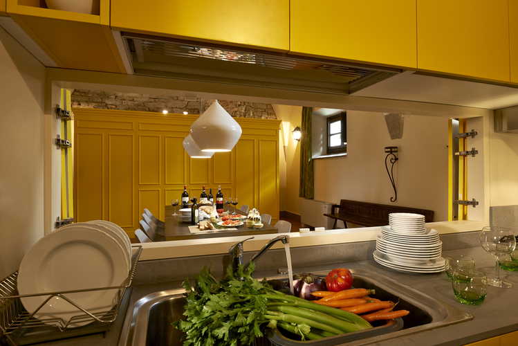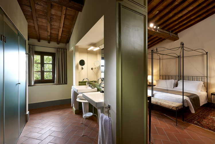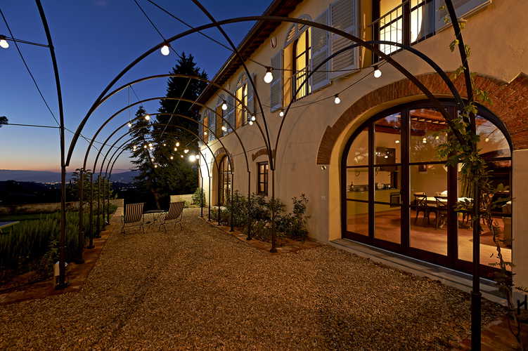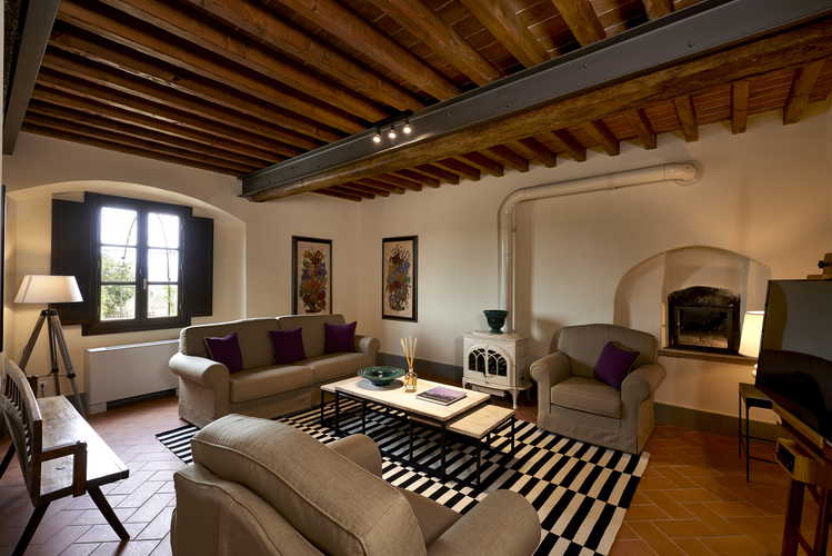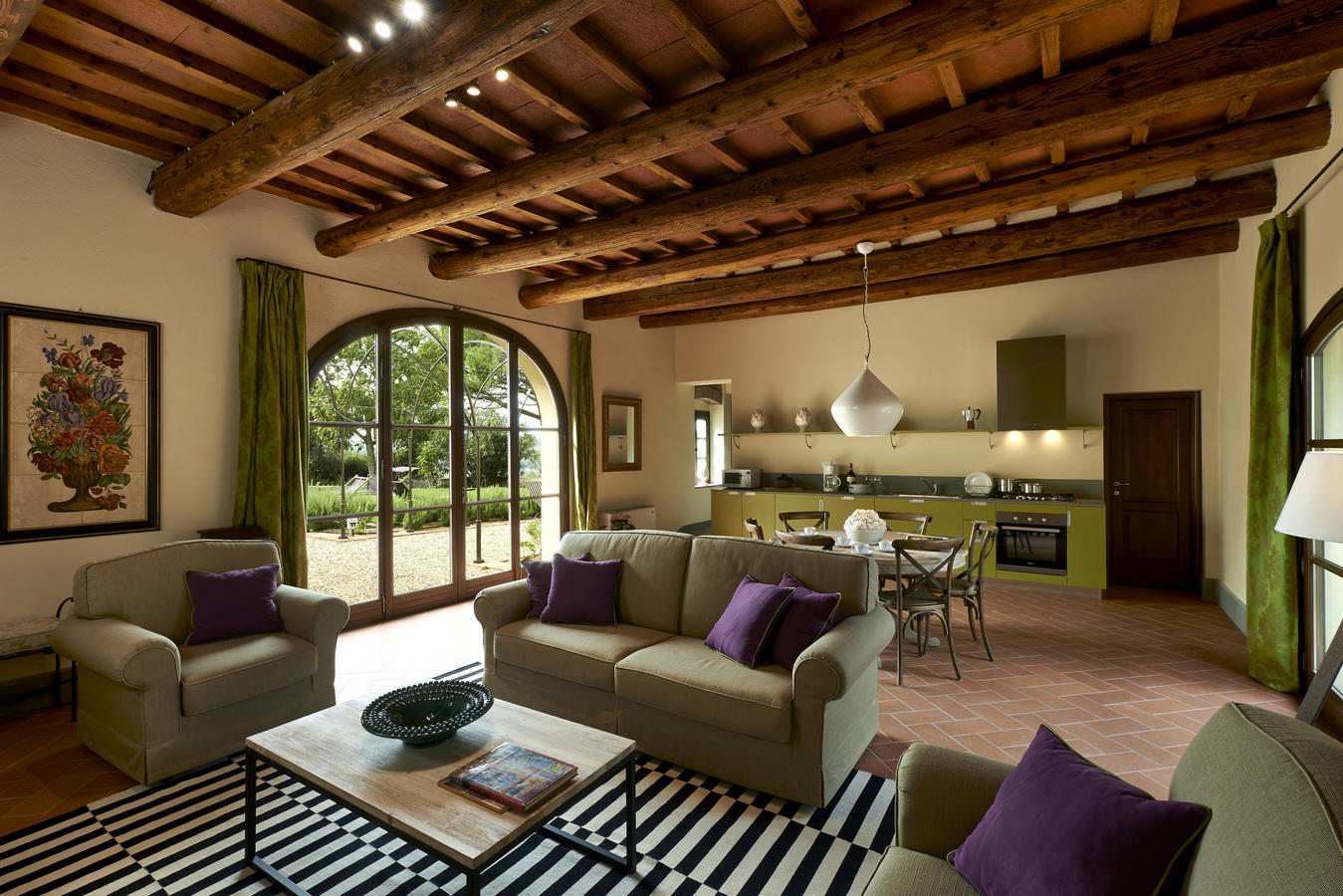 When not rented as a private villa, La Corte can be easily be divided into 5 B&B suites which range from 20-30 square meters each guaranteeing intriguing views of the Florentine hills and small nearby towns. The elegant combination of colors and contemporary decor are accented with traditional Tuscan wood beamed ceilings, terracotta floors and wrought iron furnishings.