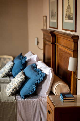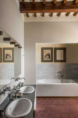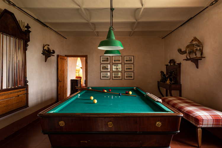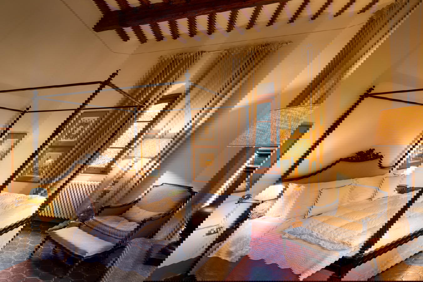 The bedrooms are located on the first floor of the villa and promise stunning views of the surround Tuscan landscape. There are 7 double bedrooms with private bathrooms on this floor, one of which is the master bedroom with a four poster bed. There is one bedroom with a French single bed considered an extra large twin bed ideal for one person with its own private bathroom. The Tuscan villa rental has remained much like it was, with family accents, photos and decor.
